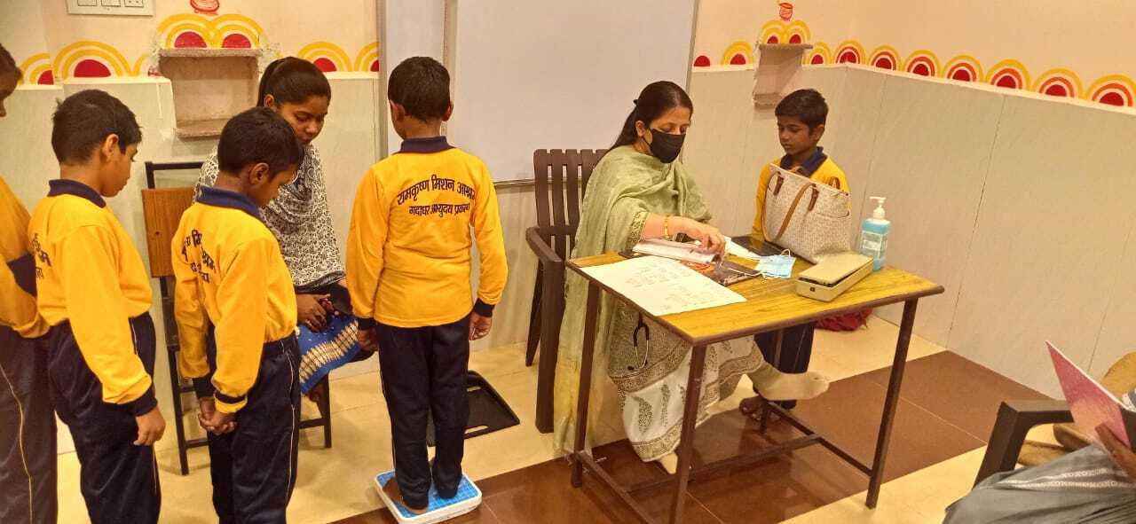 The Ashrama runs free coaching classes for poor children from the localities in and around the Ashrama. About 50 students studying in classes 1 to 5 attend these classes daily. Teachers, both honorarium-paid as well as volunteers, teach the students their regular academic courses. In addition to these, the students are also given personality building lessons encouraging them to develop their oratory skills, artistic skills as well as self-confidence. Many such children have turned out to be star-performers in their regular schools due to the encouragement they receive in these classes. Many of these children come from a very low economic background and hence cannot get nutritious food daily. The Ashrama also makes distributes daily nutritious meals as well as milk for these children. Health facilities are provided by Visiting RK Mission Charitable Dispensary free of cost. Checkups are conducted on Monthly basis.